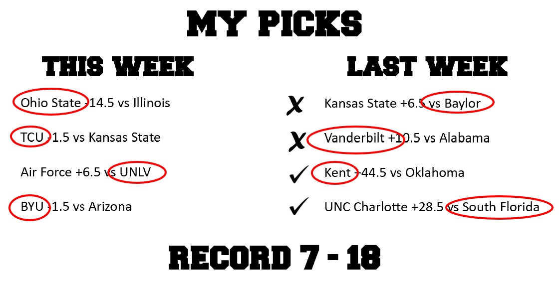 Shockingly I had my best week at 2 – 2. And if not for a greedy Crimson Tide, I could have been 3-1. That’s what this season has come to. Crowing about almost going 3-1.