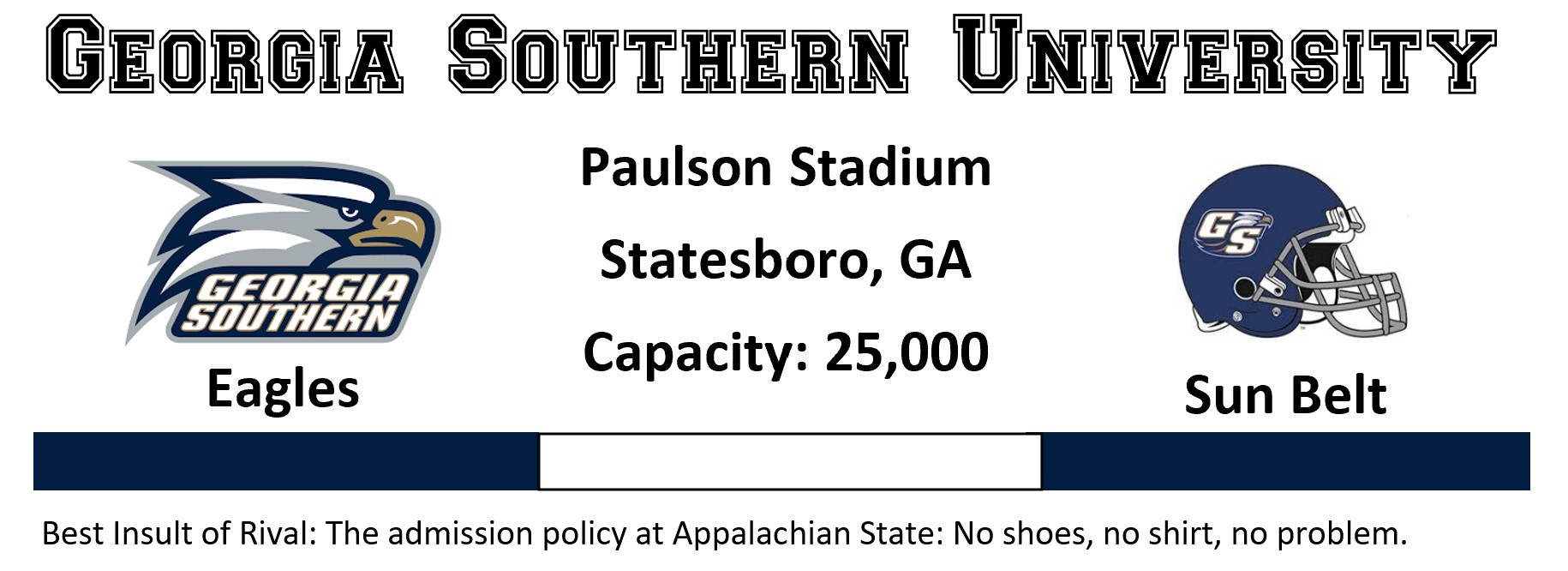 I met another guy, Andrew Baughs from College Football Tour, who was trying to hit all the FBS stadiums. He was five to six behind me in the count. We compared notes on our experiences and exchanged some swag. It was a reminder that my little journey isn’t as unique as I sometimes think it is. The same could be said for most college traditions, like Georgia Southern plain uniforms (see Penn State). But overall, the Eagle still have one of the better small school environments even with a recent heritage.